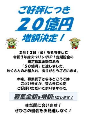 「スプリングUP定期貯金2026」の募集金額増額のご案内