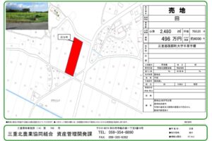 三重郡菰野町大字千草字曙 地目:田 面積:2,480㎡(750.2坪) 価格:496万円